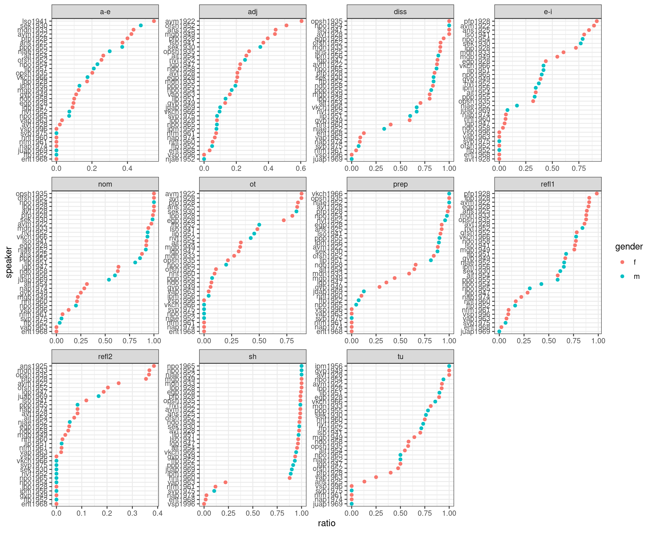 ggplot(aes(ratio, speaker, color = gender))+