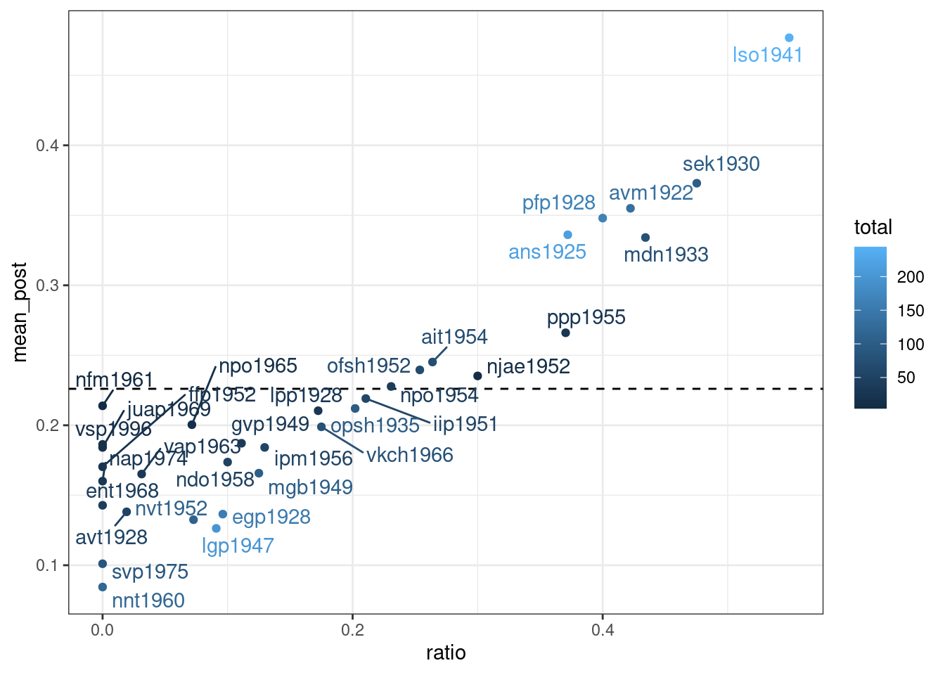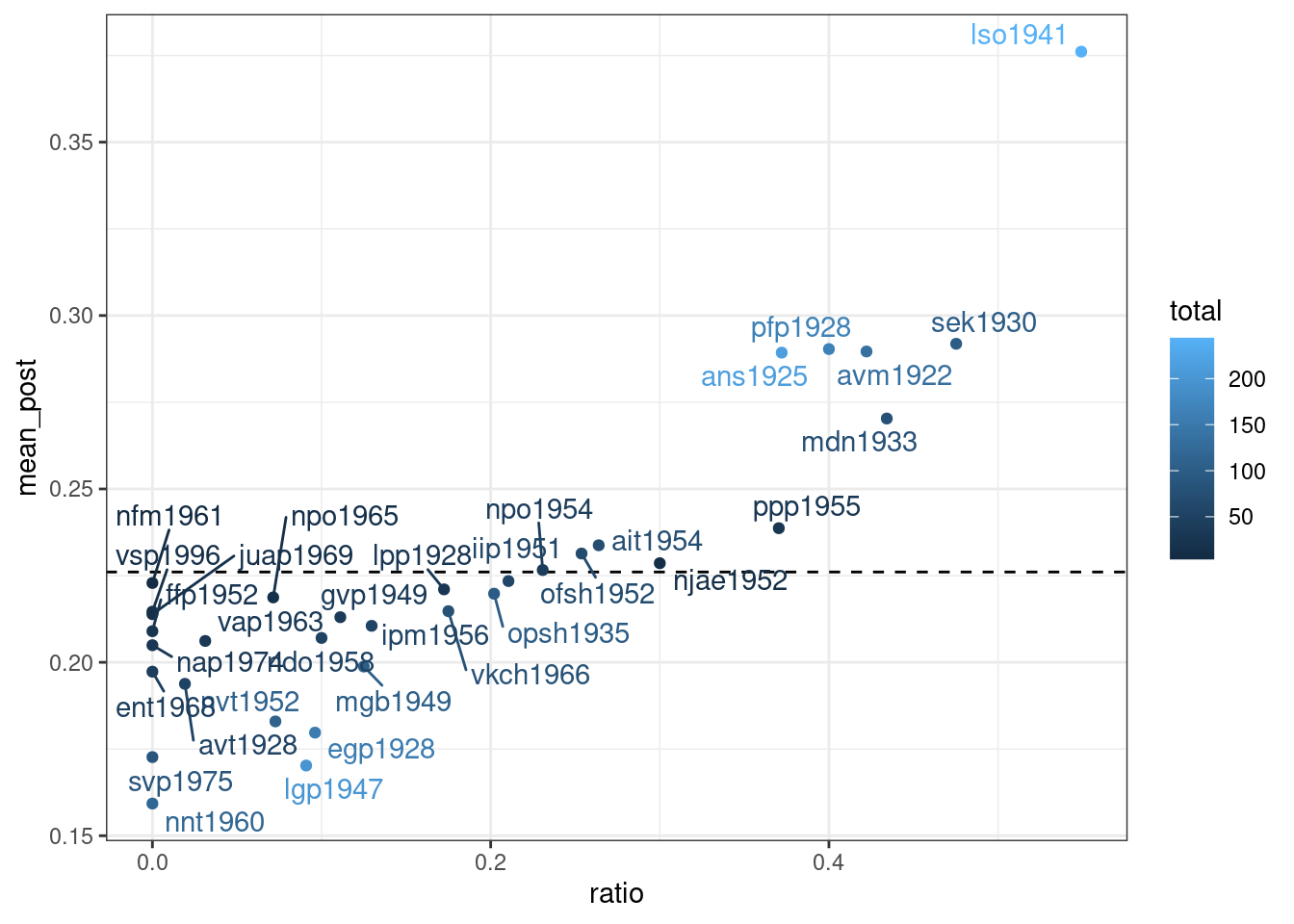 ggplot(aes(ratio, mean_post, label = speaker, color = total))+