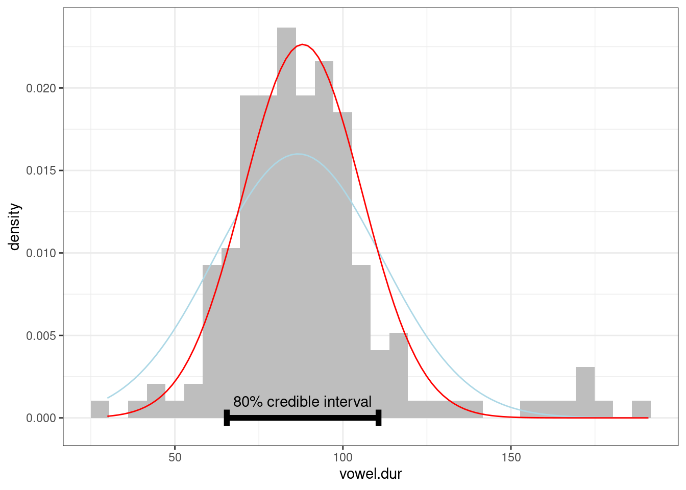 В работе (Coretta 2016) собраны данные длительности исландских гласных. Используя алгоритм максимального правдоподобия и идеи эмперической байесовской оценки, найдите априорное распределение для длительности гласных (переменная vowel.dur), используя все наблюдения в датасете и моделируя его нормальным распределением. Дальше проведите байесовский апдейт длительности гласных носителя tt01 (переменная speaker) и нарисуйте 80% доверительный интервал апостериорного распределения.