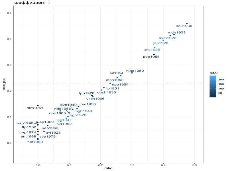 arrange(desc(ratio))В целом, всего в интервью встречается от 4 до 244 контекстов для реализации признака. Хотим ли мы верить, что lpp1928 с 29 наблюдениями диалектнее, чем mgb1949 с 104 наблюдениями, только на основании доли?