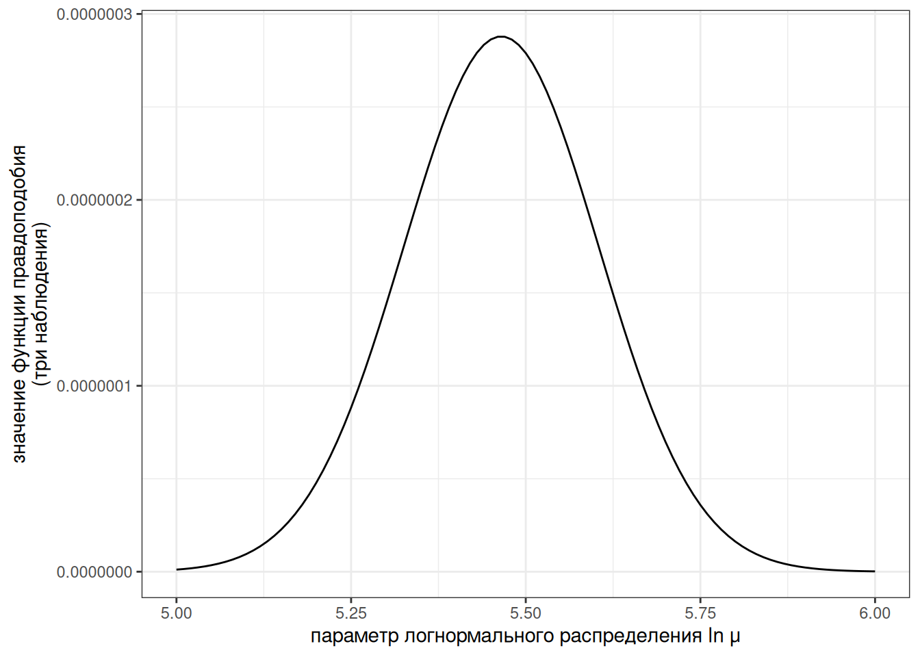 Для простоты в начале я зафиксировал один из параметров логнормального распредления: лог стандартное отклонение. Конечно, это совсем необязательно делать: можно создать матрицу значений лог среднего и лог стандартного отклонения и получить для каждой ячейки матрицы значения функции правдоподобия.