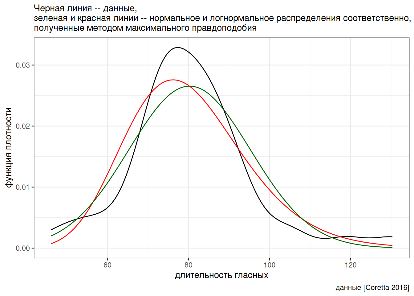 - данные длительности американских гласных из (Hillenbrand et al. 1995) и логнормальное распределение