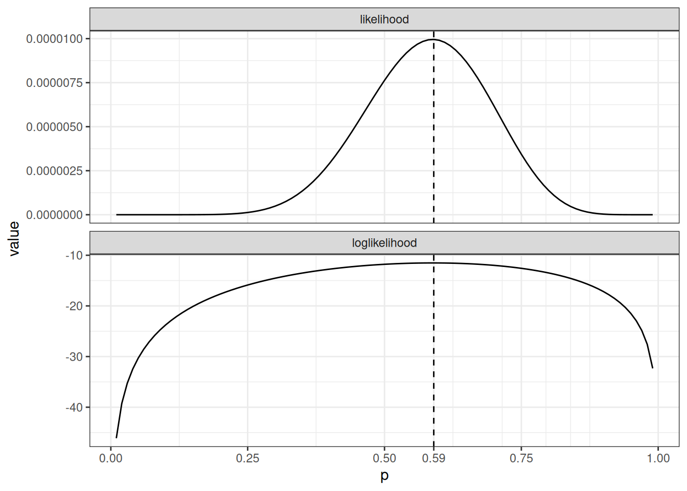 \[\text{argmax}_\theta \prod \ell(\theta|x) = \text{argmax}_\theta \sum \ln\ell(\theta|x) \]