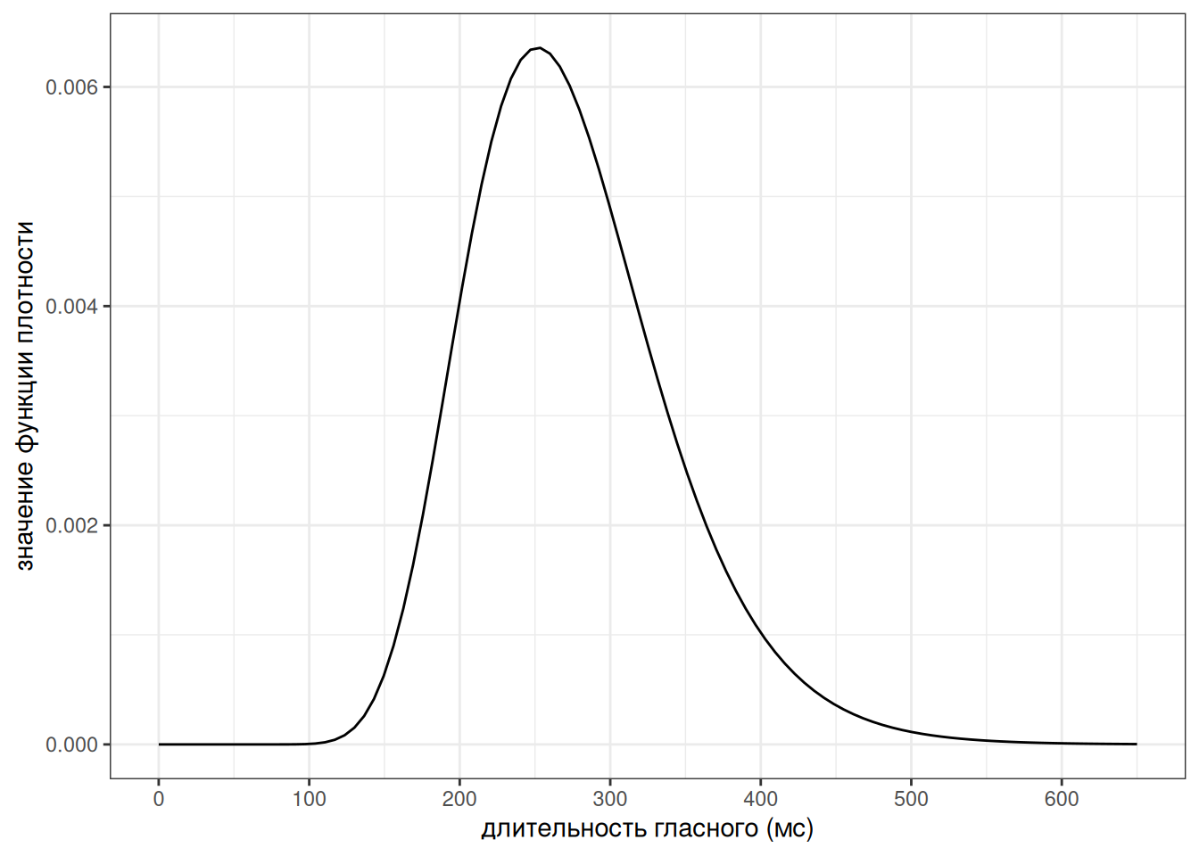 Когда у нас задано некоторое распределение, мы можем задавать к нему разные вопросы. Например, если мы верим что длительность гласных американского английского из (Hillenbrand et al. 1995) можно описать логнормальным распределением с параметрами \(\ln{\mu} =\) 5.587 и \(\ln{\sigma} =\) 0.242, то мы можем делать некотрые предсказания относительно интересующей нас переменной.