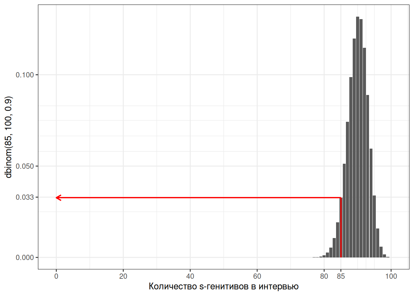 Для примера рассмотрим наш s-генетив: мы провели интервью и нам встретилось 85 s-генетивов из 100 случаев всех генетивов. Насколько хорошо подходит нам распределение с параметром p = 0.9?
