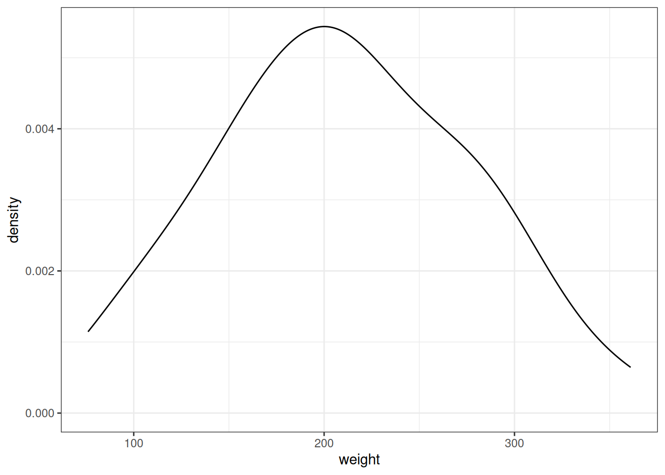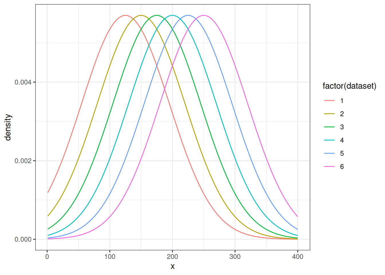 tibble(x =rep(1:400, 6),density =c(dnorm(unique(x), mean =125, sd =70),dnorm(unique(x), mean =150, sd =70),dnorm(unique(x), mean =175, sd =70),dnorm(unique(x), mean =200, sd =70),dnorm(unique(x), mean =225, sd =70),dnorm(unique(x), mean =250, sd =70)),dataset =rep(1:6, each =400)) |>ggplot(aes(x, density, color =factor(dataset)))+geom_line()