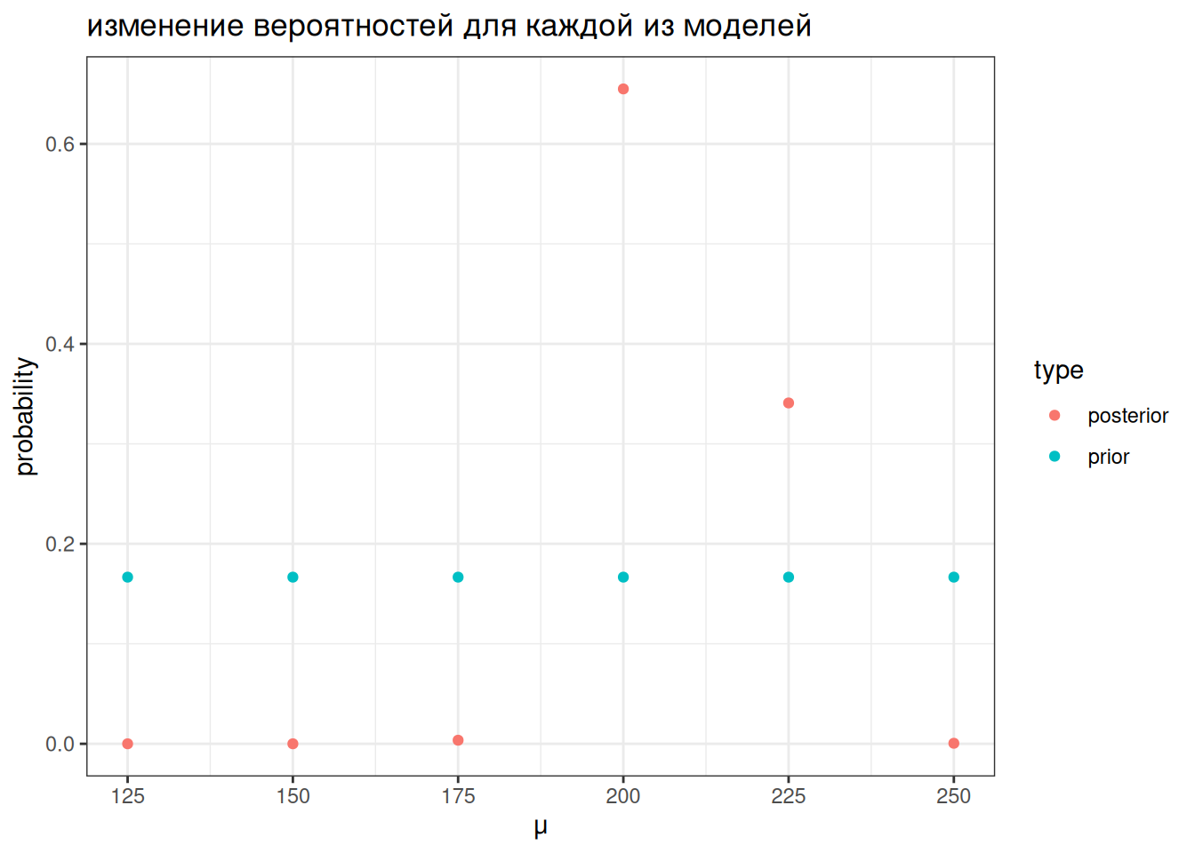 results |>select(mu, prior, posterior) |>pivot_longer(names_to ="type", values_to ="probability", prior:posterior) |>ggplot(aes(mu, probability, color = type))+geom_point()+labs(title ="изменение вероятностей для каждой из моделей",x ="μ")