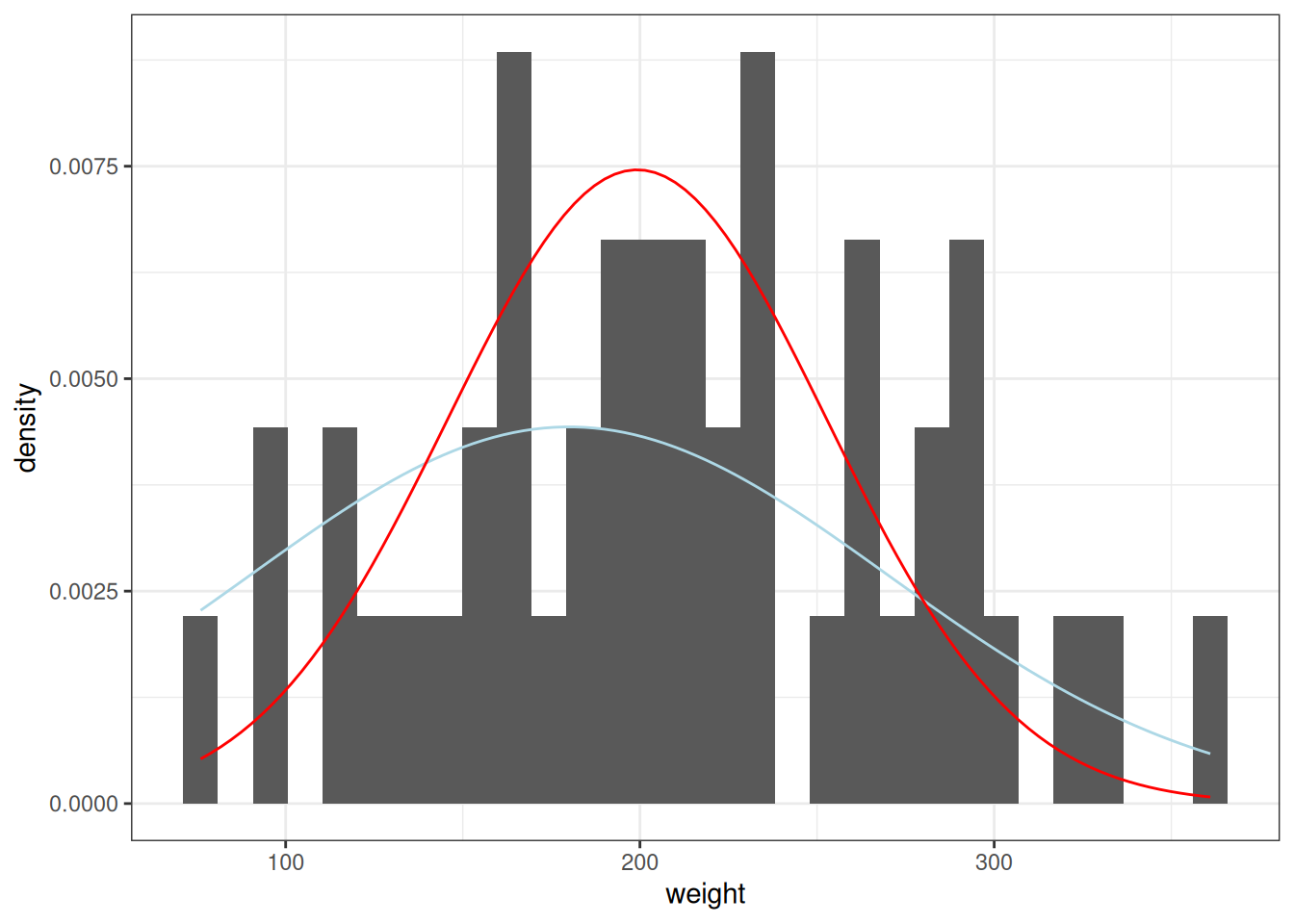 tibble(mu =seq(125, 250, by =25),prior =1/6,likelihood =c(prod(dnorm(chicks$weight, mean =125, sd =70)),prod(dnorm(chicks$weight, mean =150, sd =70)),prod(dnorm(chicks$weight, mean =175, sd =70)),prod(dnorm(chicks$weight, mean =200, sd =70)),prod(dnorm(chicks$weight, mean =225, sd =70)),prod(dnorm(chicks$weight, mean =250, sd =70))),product = prior*likelihood,posterior = product/sum(product)) -> resultsresults