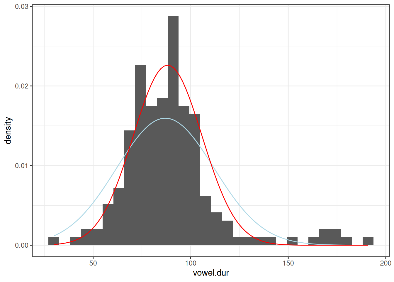 В работе (Coretta 2016) собраны данные длительности исландских гласных. Отфильтруйте данные, произнесенные носителем tt01 (переменная speaker), произведите байесовский апдейт данных, моделируя длительность гласных (переменная vowel.dur) нормальным распределением и постройте график. В качестве априорного распределения используйте нормальное распределение со средним 87 и стандартным отклонением 25.