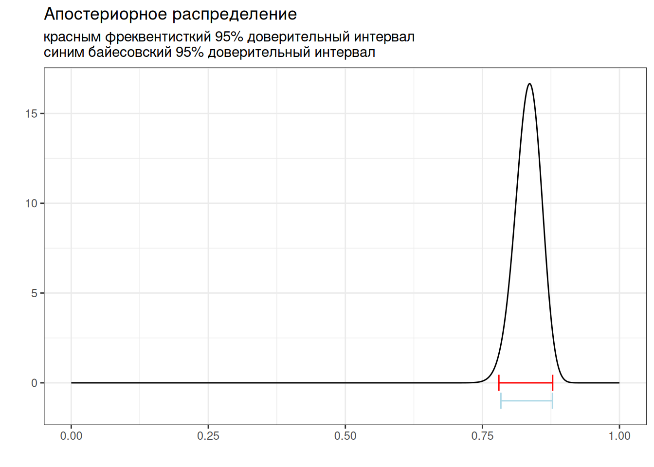 subtitle = "красным фреквентисткий 95% доверительный интервал\nсиним байесовский 95% доверительный интервал",