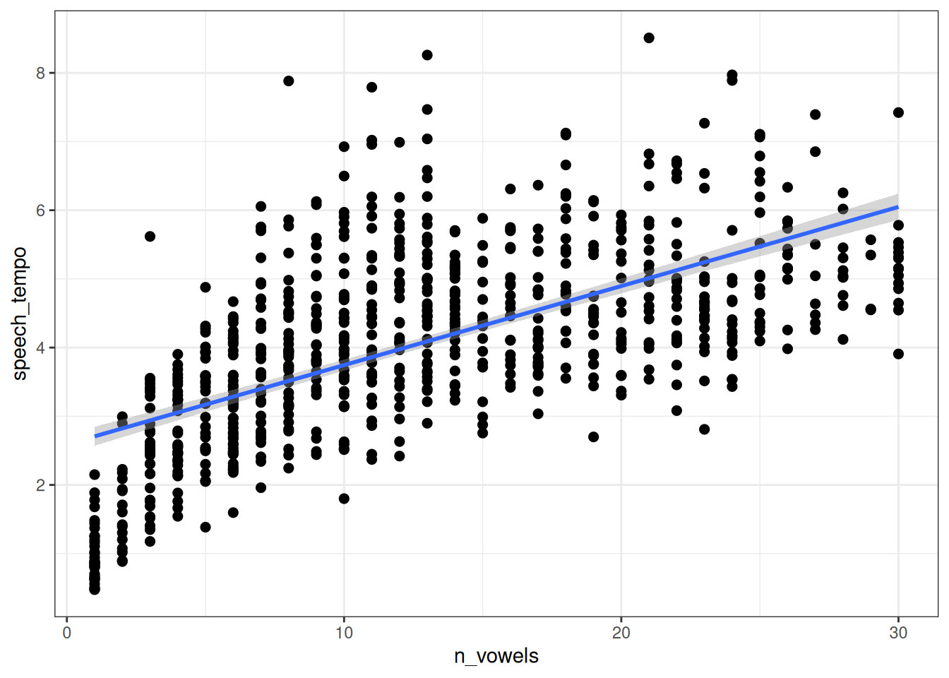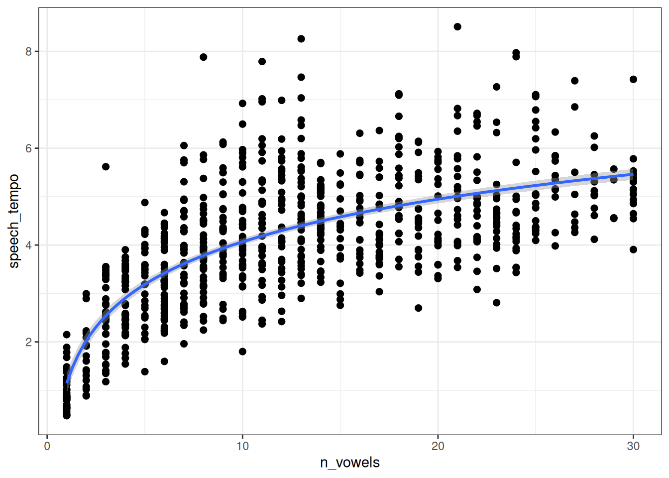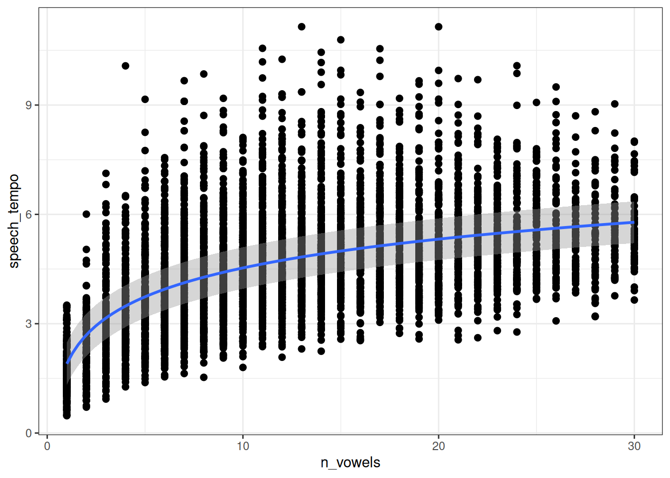 Formula: speech_tempo ~ I(log(n_vowels)) + (1 | speaker)