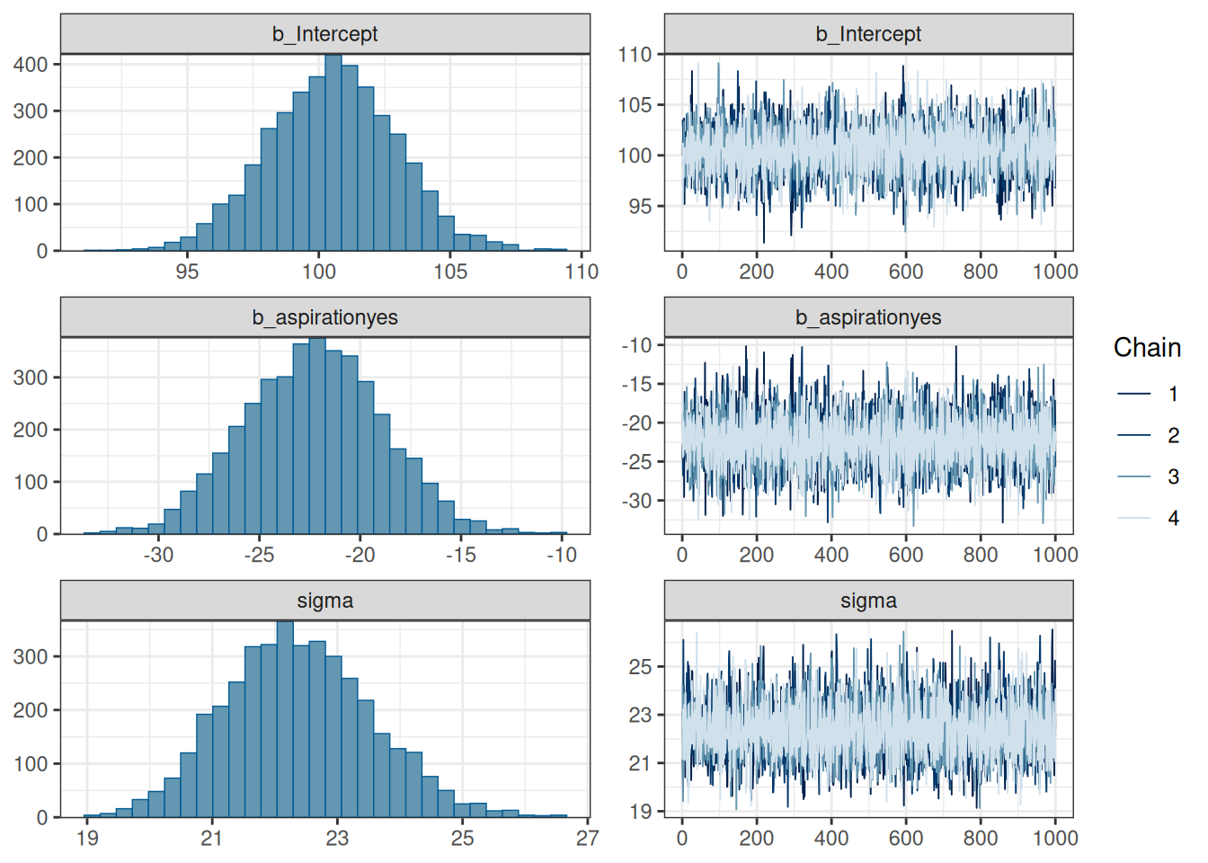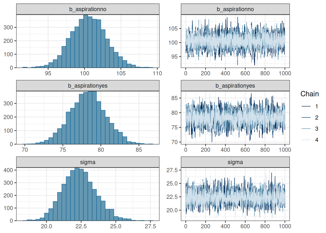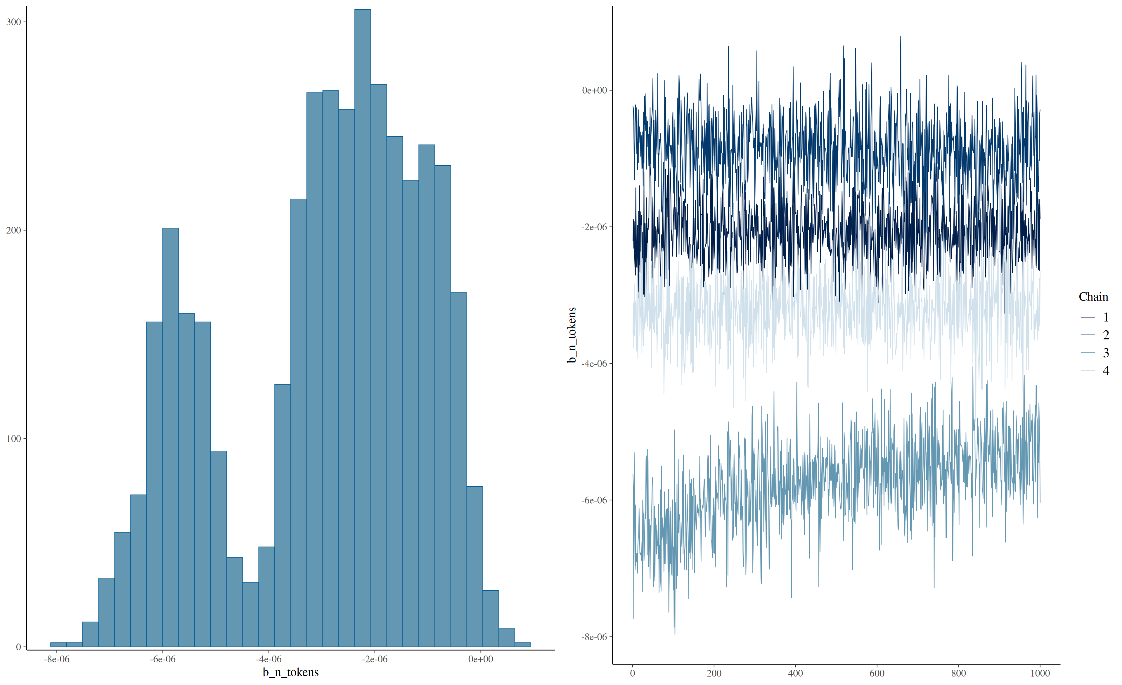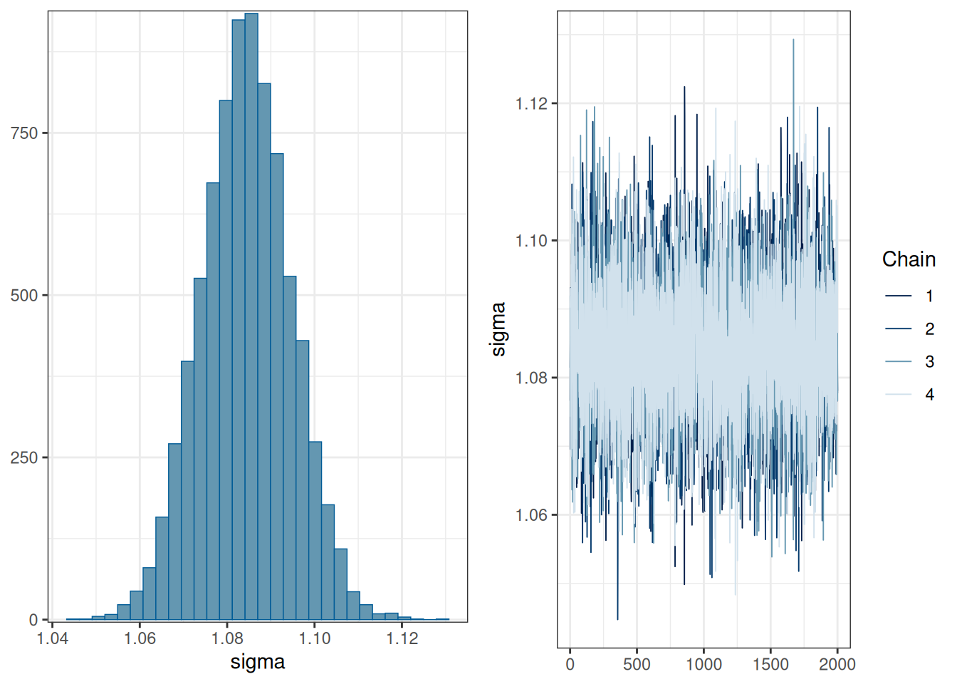 R-hat – это диагностика сходимости, которая сравнивает оценку модели, которая получается внутри цепи и между цепями (введена в (Gelman and Rubin 1992)). Если цепи не перемешались (например, если нет согласия внутри цепи и между цепями) R-hat будет иметь значение больше 1. Собственно для этого рекоммендуется запускать по-крайней мере 4 цепи. Stan возвращает что-то более сложное, что называется maximum of rank normalized split-R-hat и rank normalized folded-split-R-hat, однако мы не будем в этом разбиратсья, отсылаю к статье или к посту в блоге одного из авторов с объяснением.