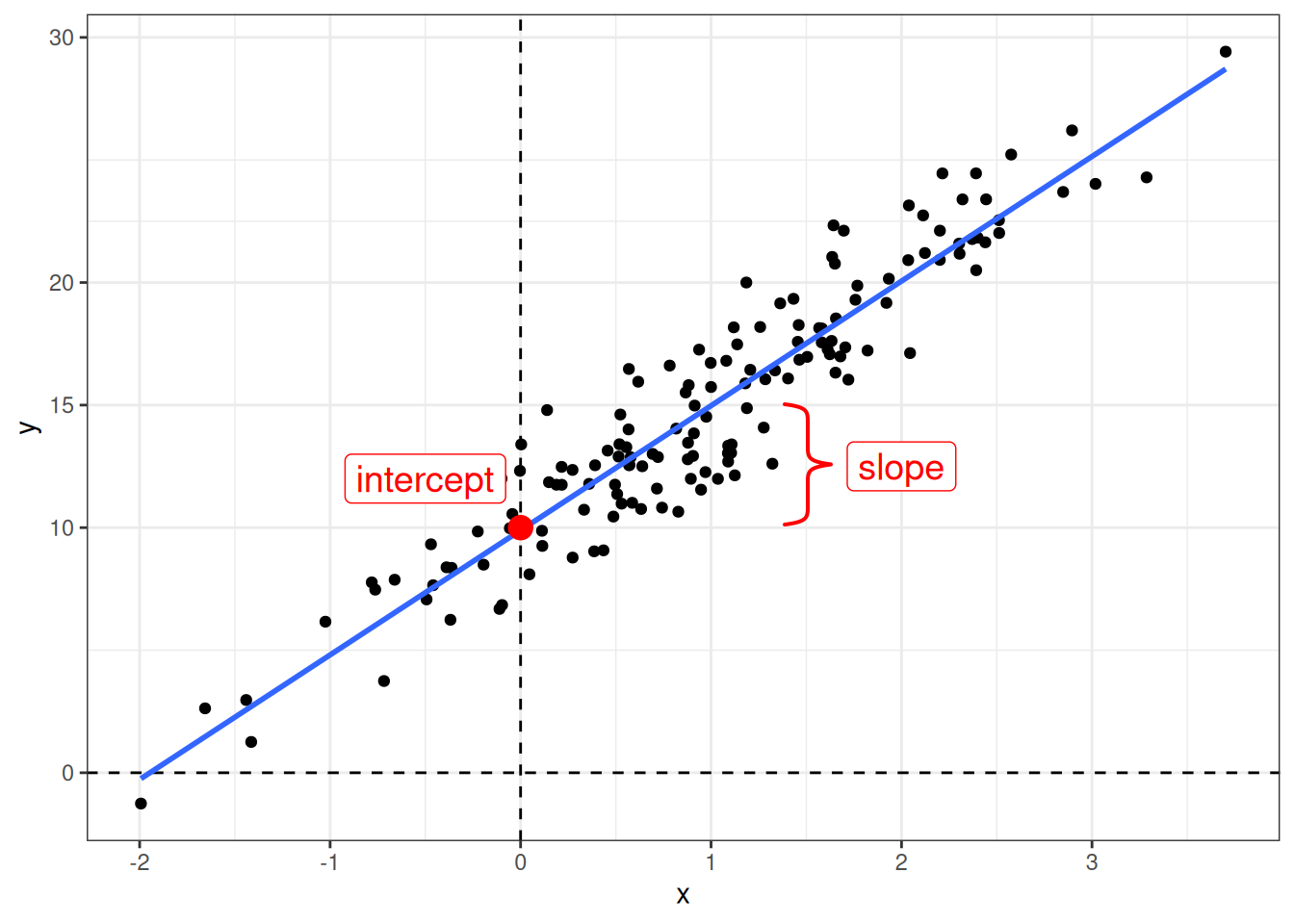 - угловой коэффициент (slope) — изменение \(y\) при изменении \(x\) на одну единицу.