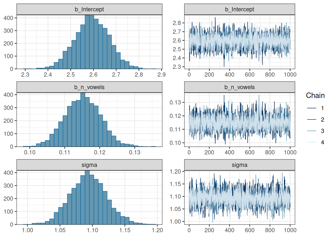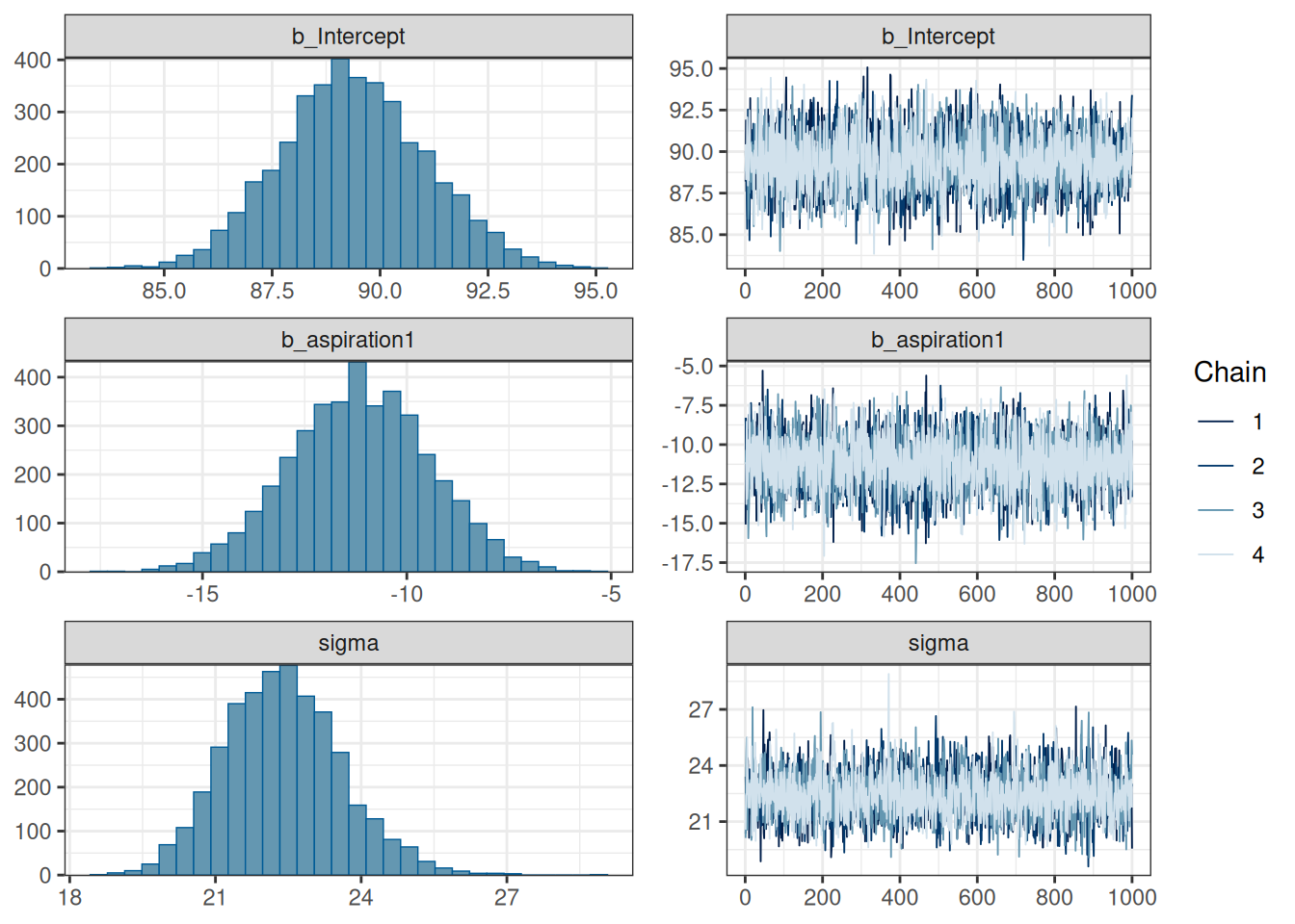 prior(normal(0, 10), class = "b", lb = 0)))После того, как функция отработала, мы можем проанализировать то, что мы получили в результате ее работы. Мы оценили три параметра: