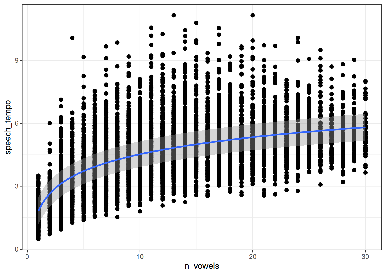 Formula: speech_tempo ~ I(log(n_vowels)) + (I(log(n_vowels)) + 1 | speaker)